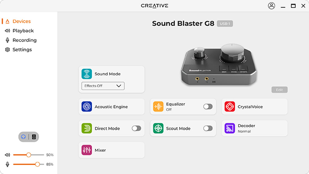 Για τους gamers, το Sound Blaster G8 είναι κάτι περισσότερο από μια απλή κάρτα ήχου—είναι ένα εργαλείο για να αποκτήσουν ανταγωνιστικό πλεονέκτημα. Με το Sound Blaster Acoustic Engine, οι χρήστες μπορούν να προσαρμόσουν τις ρυθμίσεις ήχου μέσω της εφαρμογής Creative, προσαρμόζοντας τα πάντα στις προτιμήσεις τους. Ο ισοσταθμιστής 10 ζωνών επιτρέπει ακριβείς ρυθμίσεις, από μπάσα, επιτρέποντας στους παίκτες να δημιουργήσουν ένα χαρακτηριστικό προφίλ ήχου που ταιριάζει σε οποιοδήποτε παιχνίδι.